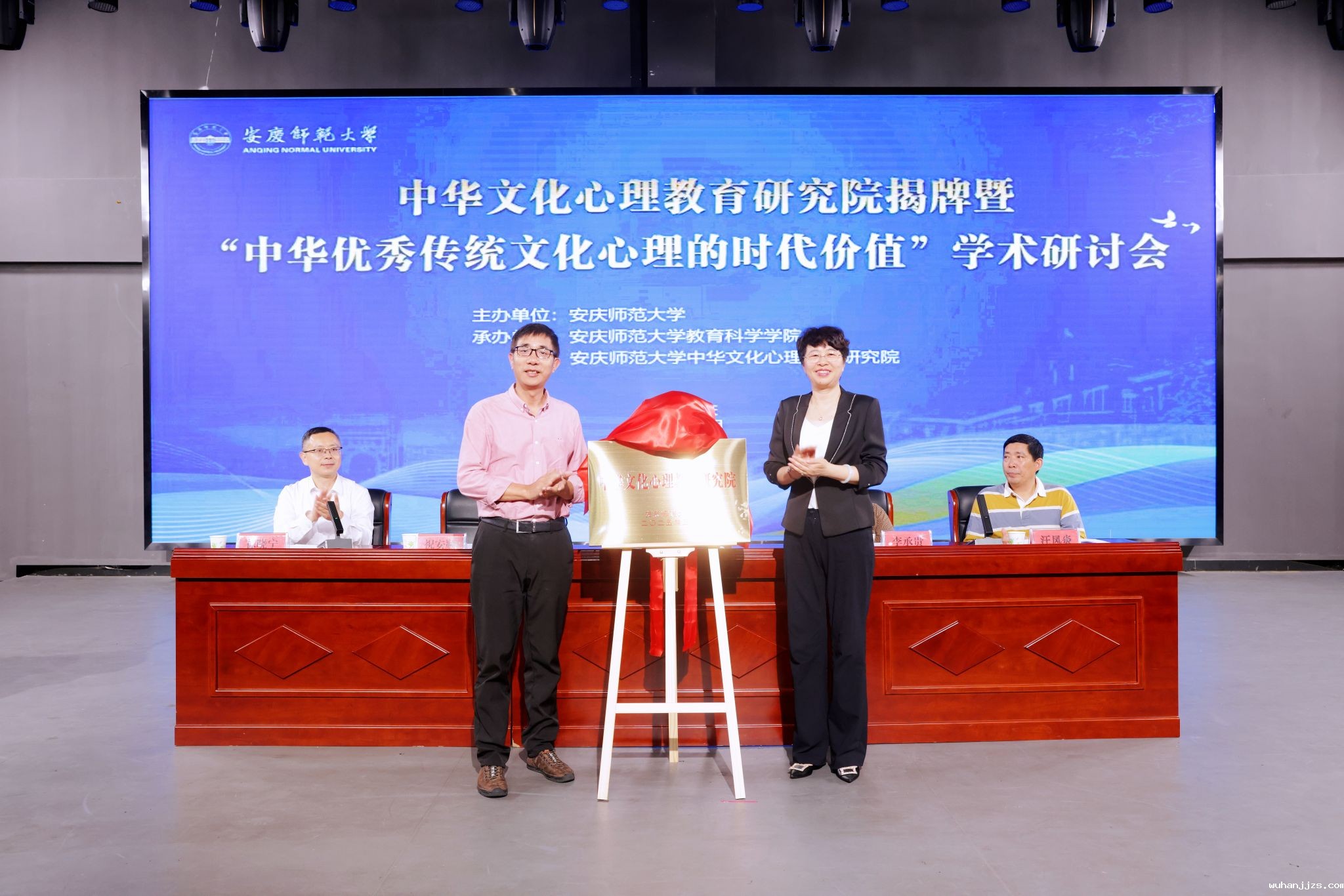 揭牌仪式上,彭凤莲为李承贵、祝安顺、汪凤炎颁发了研究院特聘研究员聘书,并与祝安顺共同为中华文化心理教育研究院揭牌。